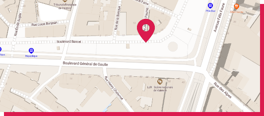 Arrêt Centre-ville (Pôle Bus), sur les zébras du Bd Bancel face à l’office de tourisme.