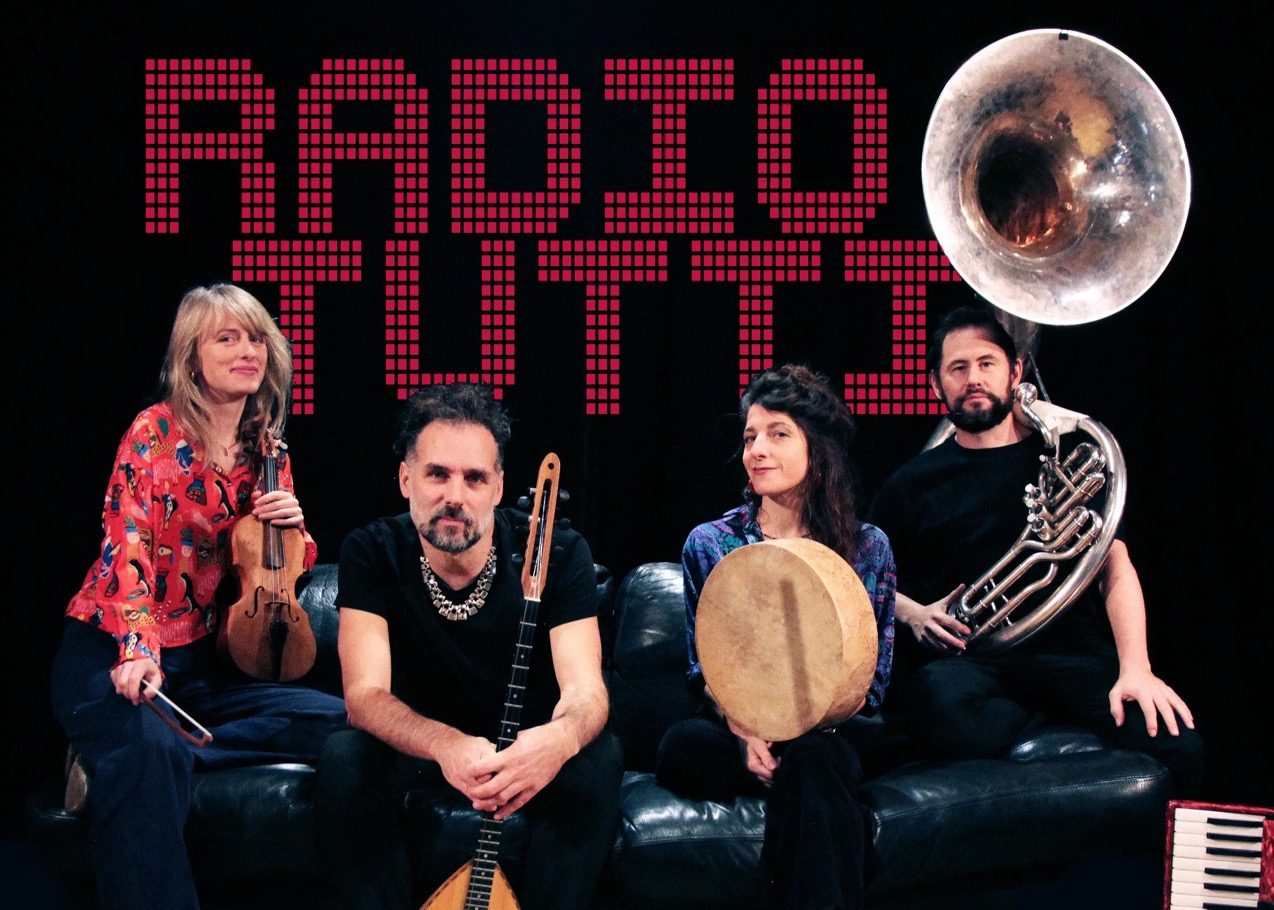 Entre l’ancrage dans des traditions locales symbolisé par le twang (effet vocal venu de différents folklores du monde permettant d’augmenter la puissance de chant) et la dynamique électro du club, Radio Tutti connecte l’hier et l’aujourd’hui dans sa recherche infatigable de lendemains qui dansent. Des chansons des répertoires traditionnels du Sud de l’Italie et de Galice sont boostées par des influences venues d’ailleurs et survitaminées par des injections électros… Un bal folk 2.0, une fête de village-monde.